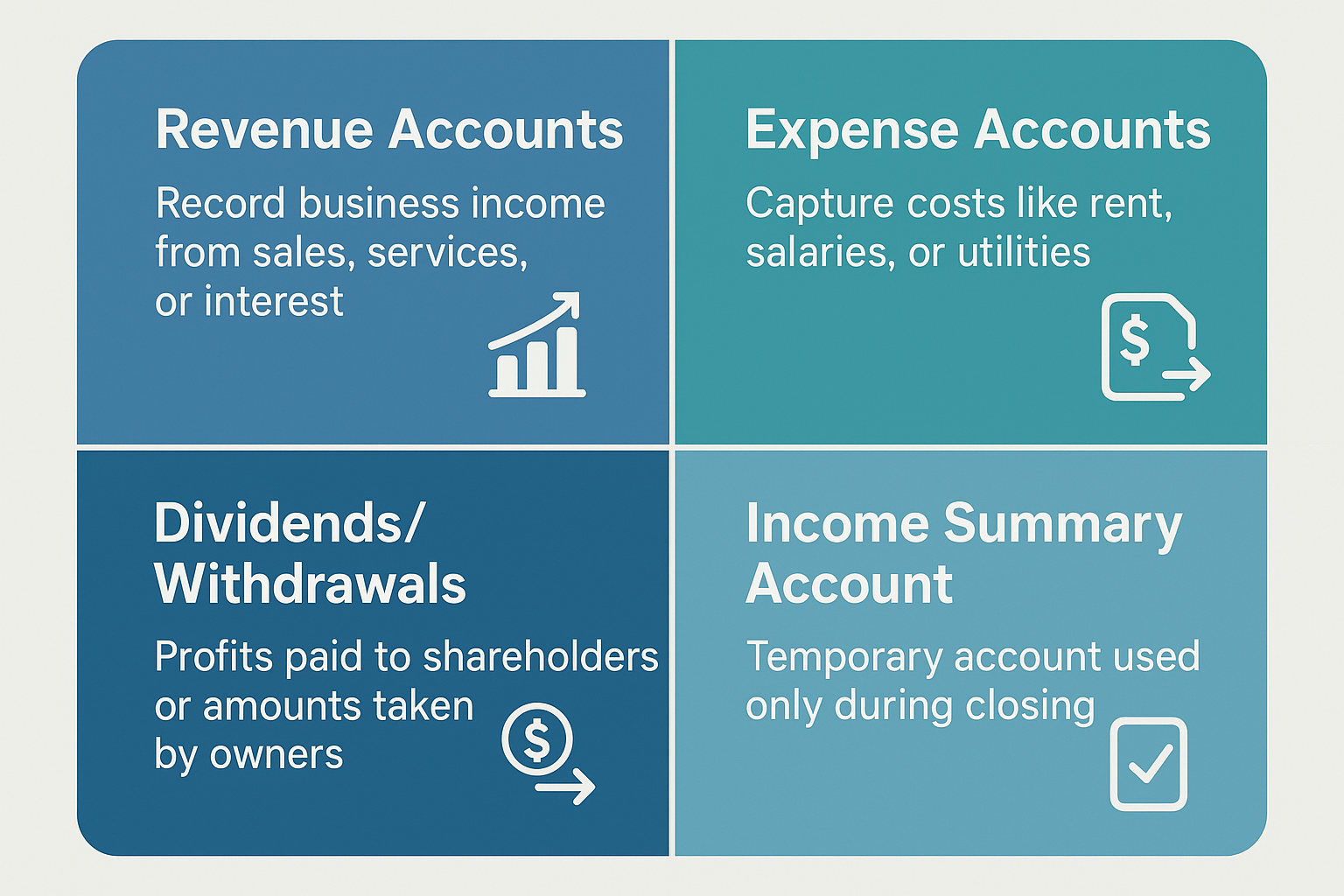 - Income Summary account: A temporary account used to manage profit or loss before moving it into retained earnings or capital