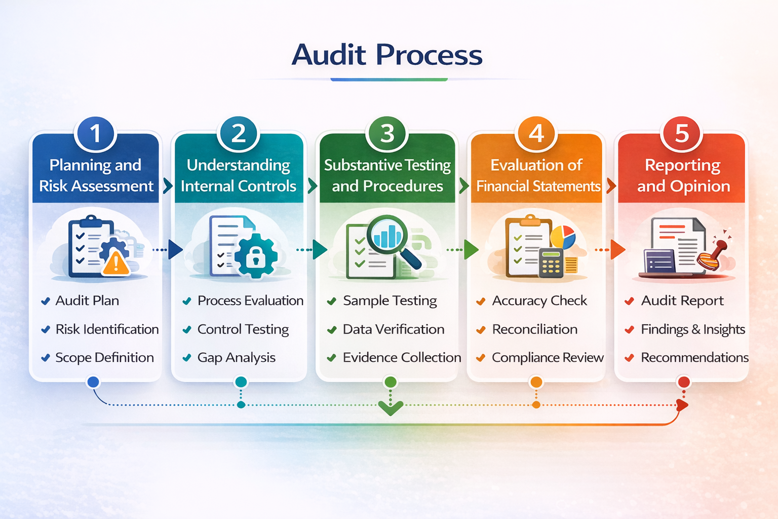 Auditing financial reports follows a clear structure, helping the auditor form a well-supported opinion. Here's what the step-by-step financial audit procedure looks like: