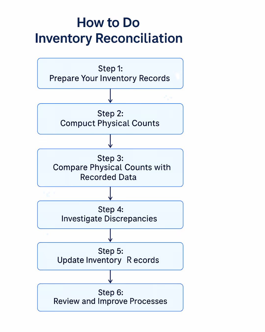 Following a structured process makes reconciling inventory faster, more accurate, and easier to manage. Here’s how to approach it effectively: