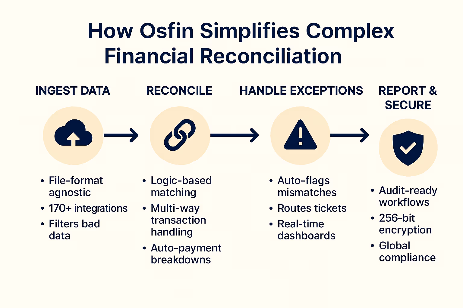 Osfin is purpose-built for high-volume reconciliation with 100% match accuracy across millions of transactions. Unlike general accounting software, it offers logic-based anomaly detection, 170+ native integrations, real-time processing, and handles complex data formats like ACH, SWIFT, and ISO 20022 automatically.