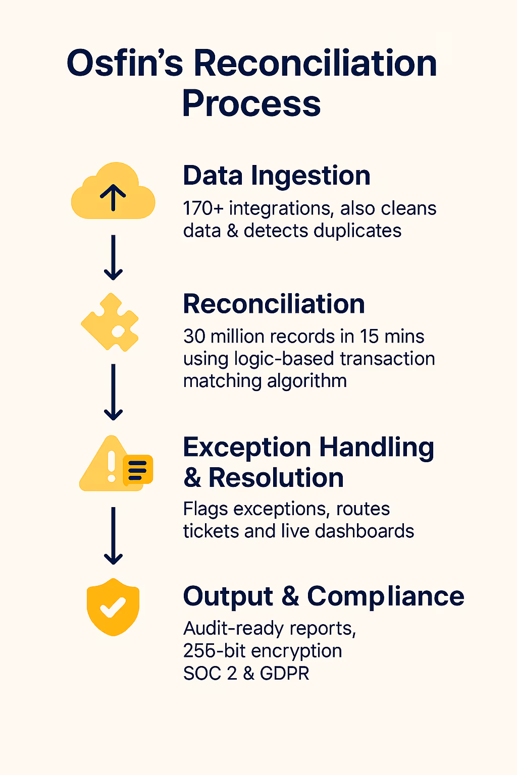 - Osfin's reconciliation platform complies with stringent global standards, including ISO 27001 and GDPR. Security features like 256-bit encryption, role-based access controls, and two-factor authentication protects sensitive financial data of your financial institution.