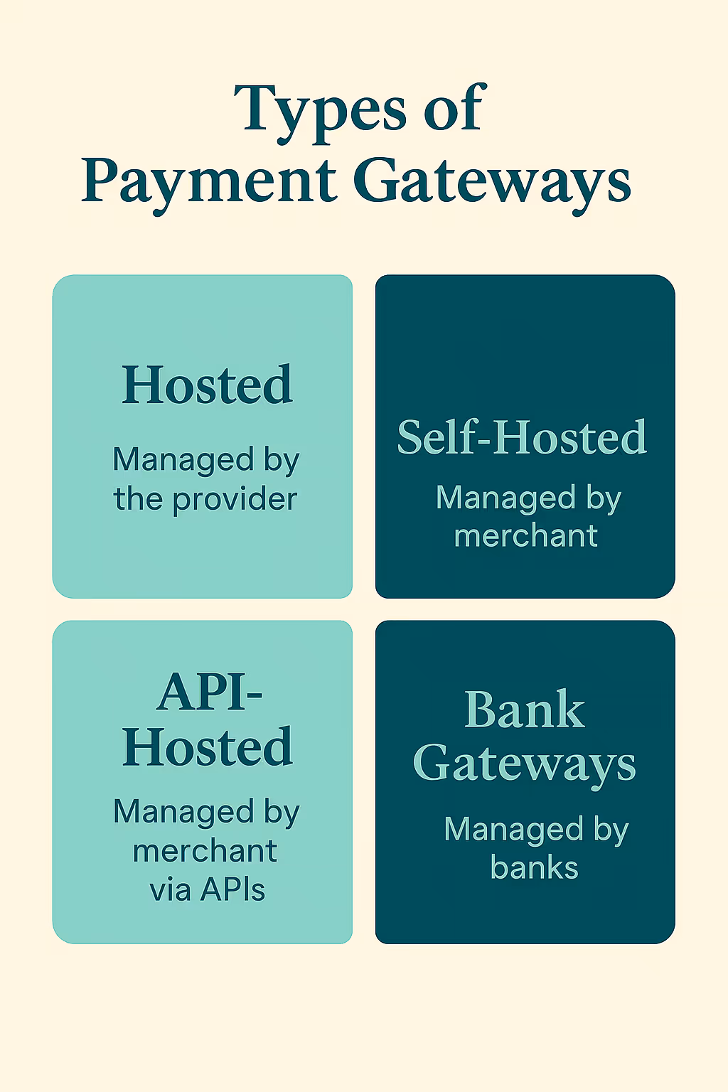 There are various types of payment gateways based on how they integrate with the merchant's platform or app. Here are the main types of gateways and how they function.
