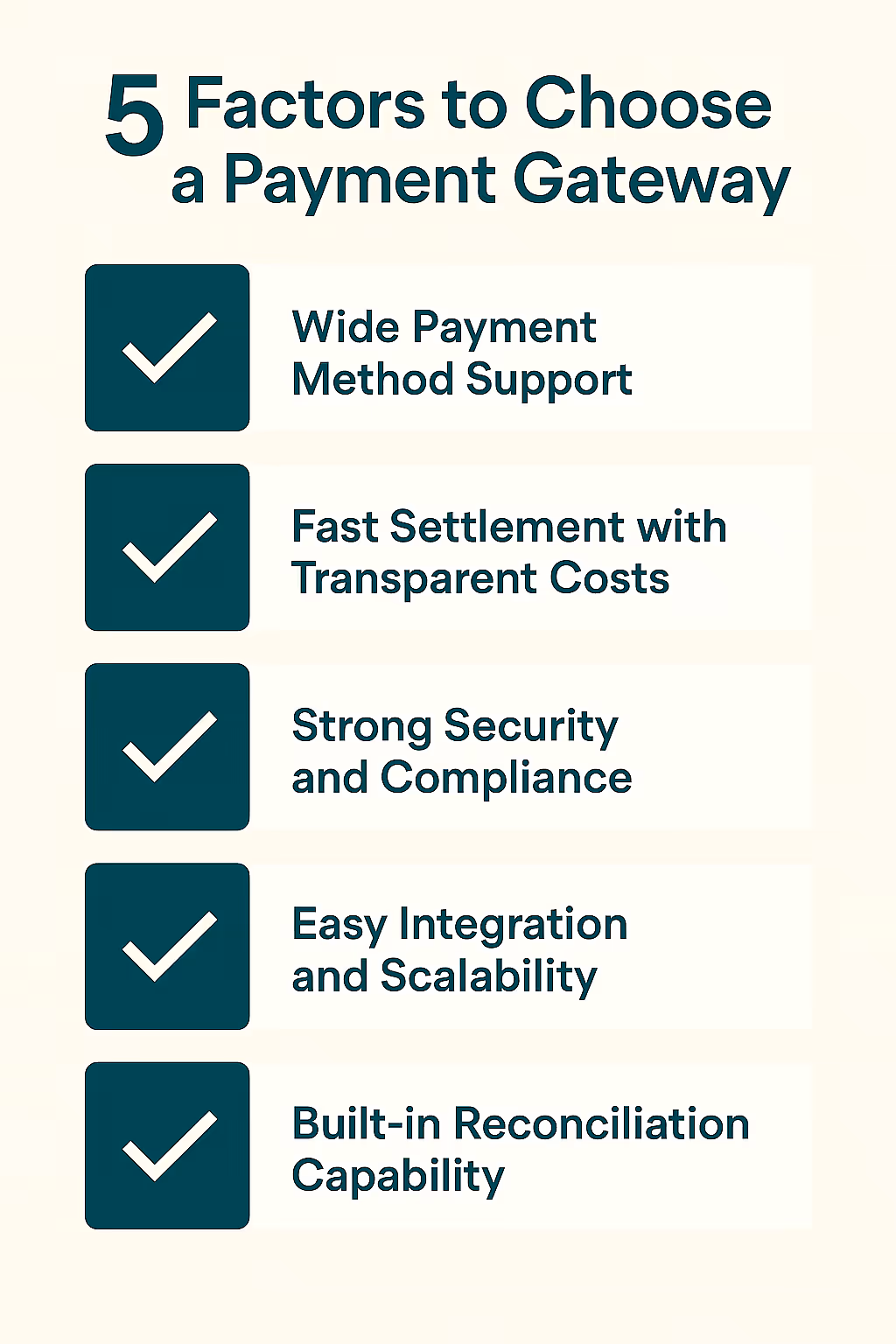 Choosing a payment gateway can feel overwhelming with so many providers out there. The best way to approach it is to focus on what will make payments reliable, secure, and easy to manage for your business. Here are five factors worth paying attention to.