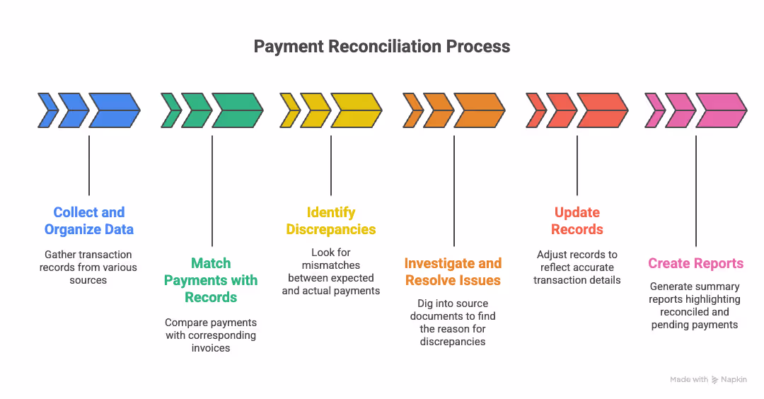 The payment reconciliation process can vary depending on whether you're reconciling bank transfers, online payments, or vendor invoices. Still, most businesses follow a common workflow to track, verify, and update financial records.