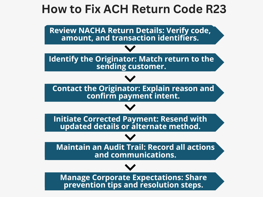 When a credit entry is returned with R23: Credit Entry Refused by Receiver, banks must act quickly to address the failed settlement, protect client relationships, and maintain operational accuracy. Here’s how the R23 code can be fixed: