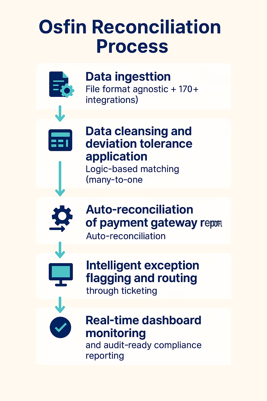 - Custom Deviation Tolerances and Data Cleansing: During ingestion, Osfin applies custom rules to standardize dates, reference IDs, amounts and filters out poor-quality or inconsistent data. This ReconArt competitor also performs advanced detection of duplicates or outliers at entry point and prevents downstream reconciliation errors.